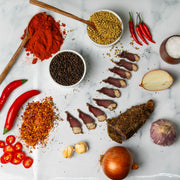 Beef, Natural Rock Salt, Worcestershire Sauce, Malt Vinegar, Black Pepper, Coriander, Chili Powder, Garlic Powder, Brown Sugar, Onion Powder, Paprika, Citric Acid, Chili Flakes.